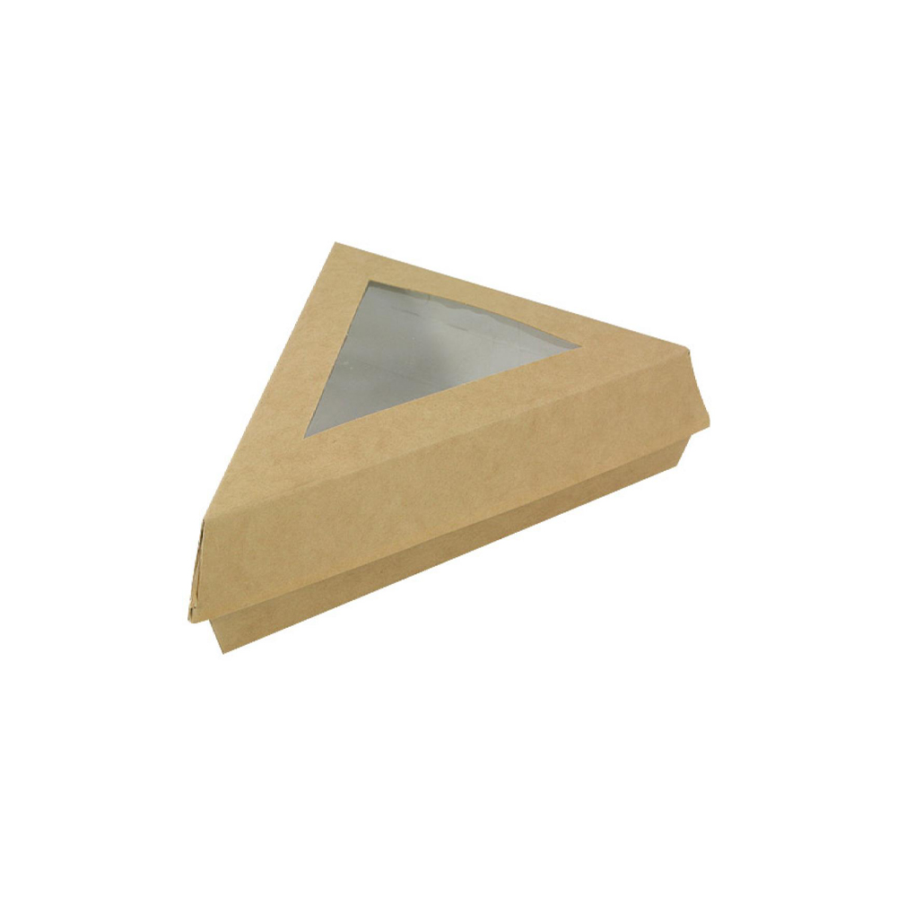 La boîte pizza triangle en carton kraft brun avec fenêtre est idéale pour la présentation et la vente à emporter de parts de pizza, quiches ou produits pâtissiers.