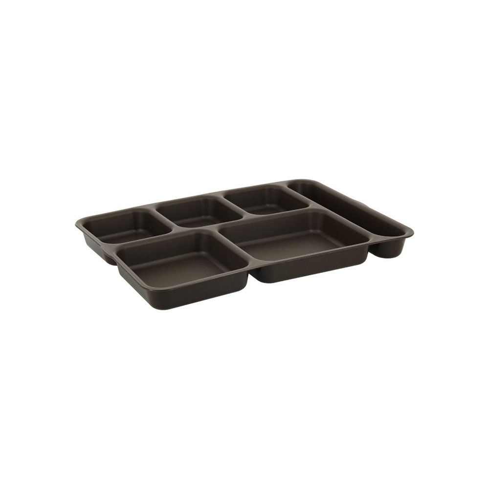 Plateau repas 6 compartiments réutilisable en copolymère brun, robuste et empilable.