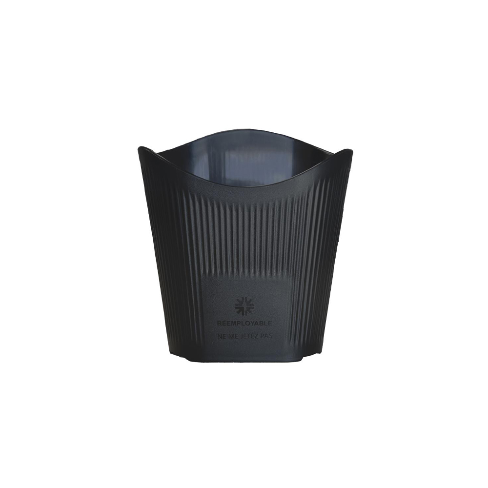 Pochette à frites Petit Modèle réutilisable Re’Box 60 x 104 x 120 mm, lot de 50. En polypropylène noir, réutilisable, résistante à la chaleur, ergonomique et pratique pour présenter et servir des frites croustillantes.